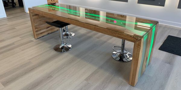 Application de l’Époxy : Nous utilisons une résine époxy de haute qualité, qui non seulement protège le bois, mais crée également des effets visuels spectaculaires. Que ce soient des teintes vibrantes ou des nuances délicates, notre équipe maîtrise l'art de l'infusion de couleurs et de la création de designs uniques, transformant chaque table en une œuvre d’art.